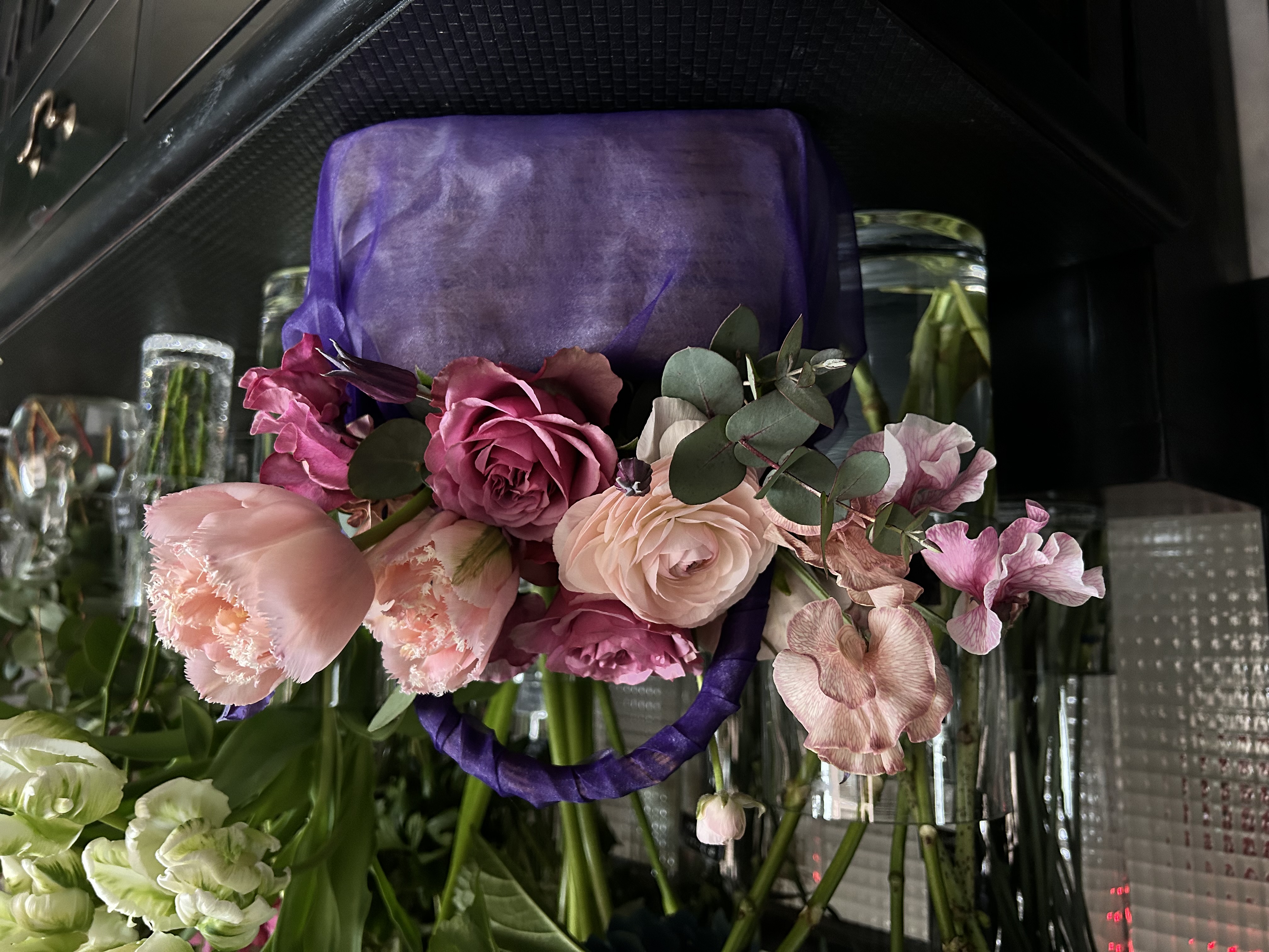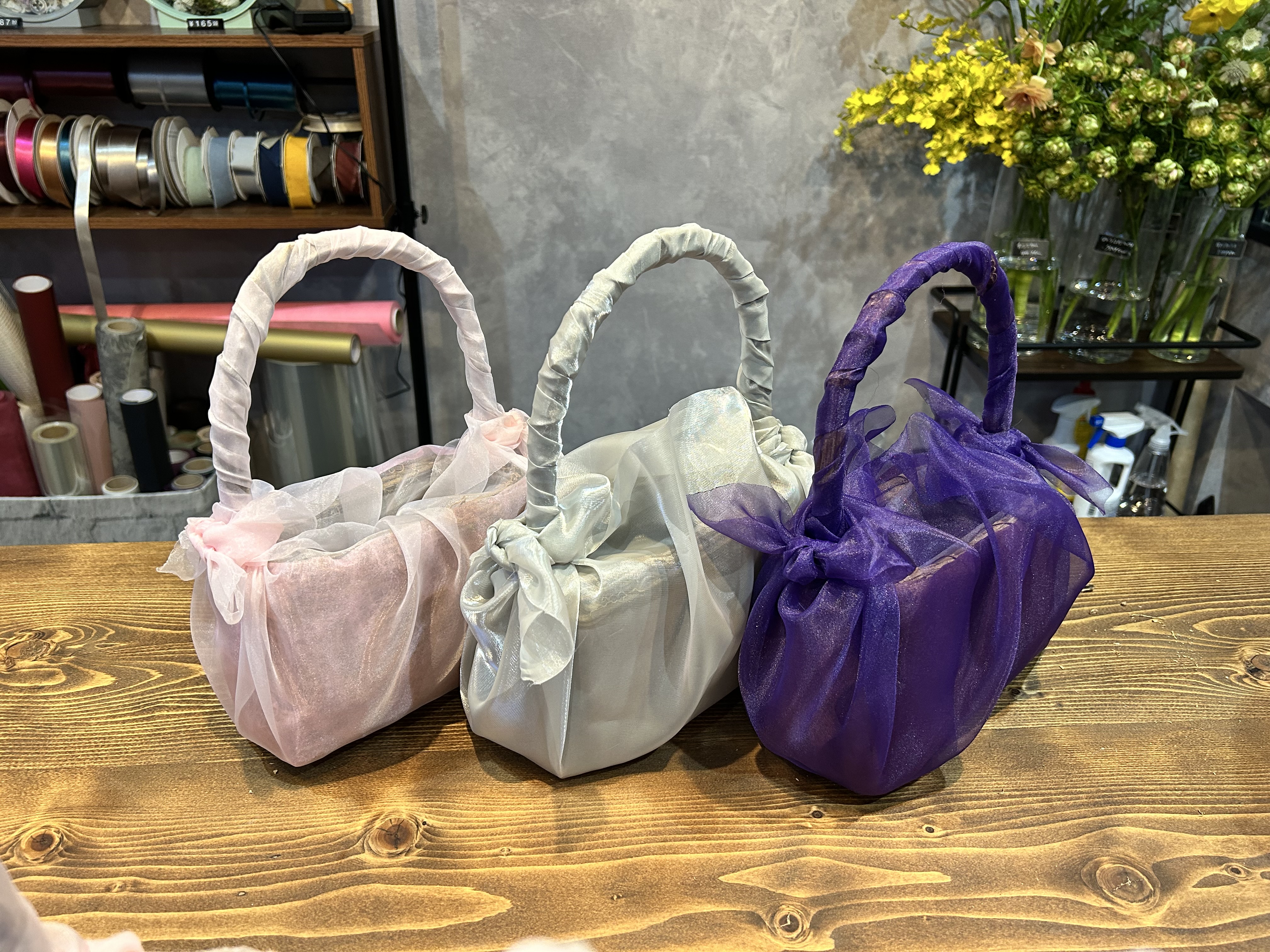 季節のお花をポジャギ籠いっぱいにしてお届けいたします。